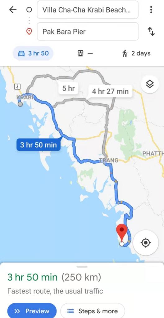 Al día siguiente teníamos que tomar un speedboat (barco que va RAPIDÍSIMO… y pensar que soy traductora jajaja) en Pak Bara. No fue fácil llegar porque no era temporada alta y no había autobuses que te llevaran. Tuvimos que hablar con gente de la estación de autobuses para que le hablaran a un taxi porque, por alguna razón, en Grab no estaba la opción. Supongo que porque era bastante lejos. El taxi nos cobró 3,500 BAHT (115 USD). Después de casi 4 horas, llegamos a Pak Bara.