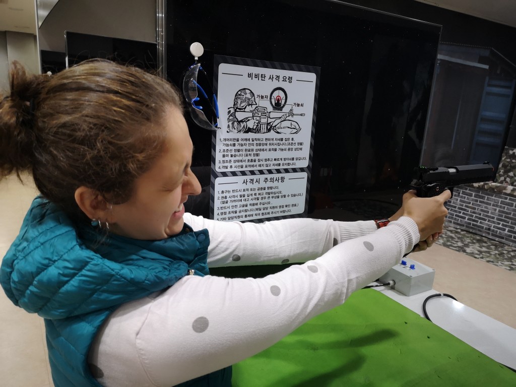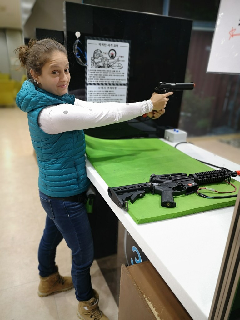 No recuerdo la última vez que disparé el rifle pero supongo que ya 20 años quizá han pasado. Mi puntería pensaba que no era tan buena pero ¿qué creen? Resultó mucho mejor de lo que pensaba. El chico que daba las instrucciones me decía que cerrara el otro ojo. Y yo: ¿eh? ¿cómo? ¿así? Y cerraba el mismo… mejor me dijo que cambiara la pistola de lado jajajaja. O sea, ¿toda la gente puede cerrar el derecho y el izquierdo? Sólo yo estoy medio mensa, o ¿qué pasa?